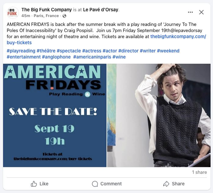I’ll be heading to Paris next month to catch a reading of my play JOURNEY TO THE POLES OF INACCESSIBILITY by the Big Funk Company. I’m really looking forward to seeing the reading with a new group of people tackling the play. Big Funk has done several of my short plays and one-acts over the past year, and this is the cherry on top.
